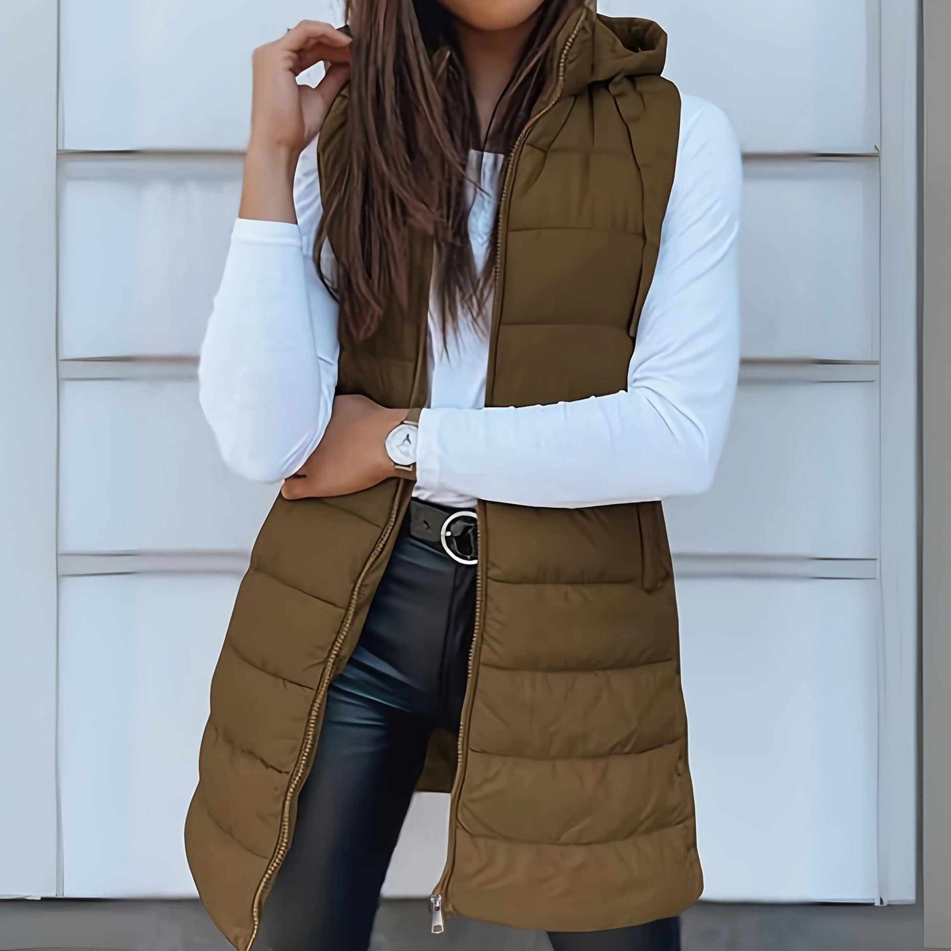 Diese lange Steppweste ist der perfekte Begleiter für die Übergangszeit – sie kombiniert funktionale Wärme mit lässigem Chic. Der figurbetonte Schnitt sorgt für eine schmeichelnde Silhouette, während die Kapuze und der durchgehende Reißverschluss praktischen Komfort bieten. Ideal für lässige Freizeit- oder City-Looks.