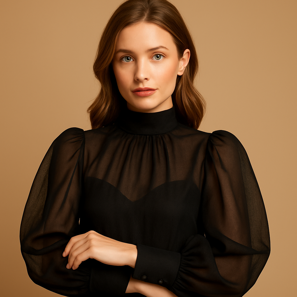 Diese hochgeschlossene Bluse aus leichtem, durchscheinendem Stoff setzt mit ihren voluminösen Puffärmeln und zarten, geknöpften Manschetten einen raffinierten Akzent. Das durchscheinende schwarze Design bietet eine anmutige Silhouette, die sich mühelos mit maßgeschneiderten Hosen oder Abendröcken kombinieren lässt - ideal für die gehobene Tagesgarderobe oder das elegante Ausgehen.