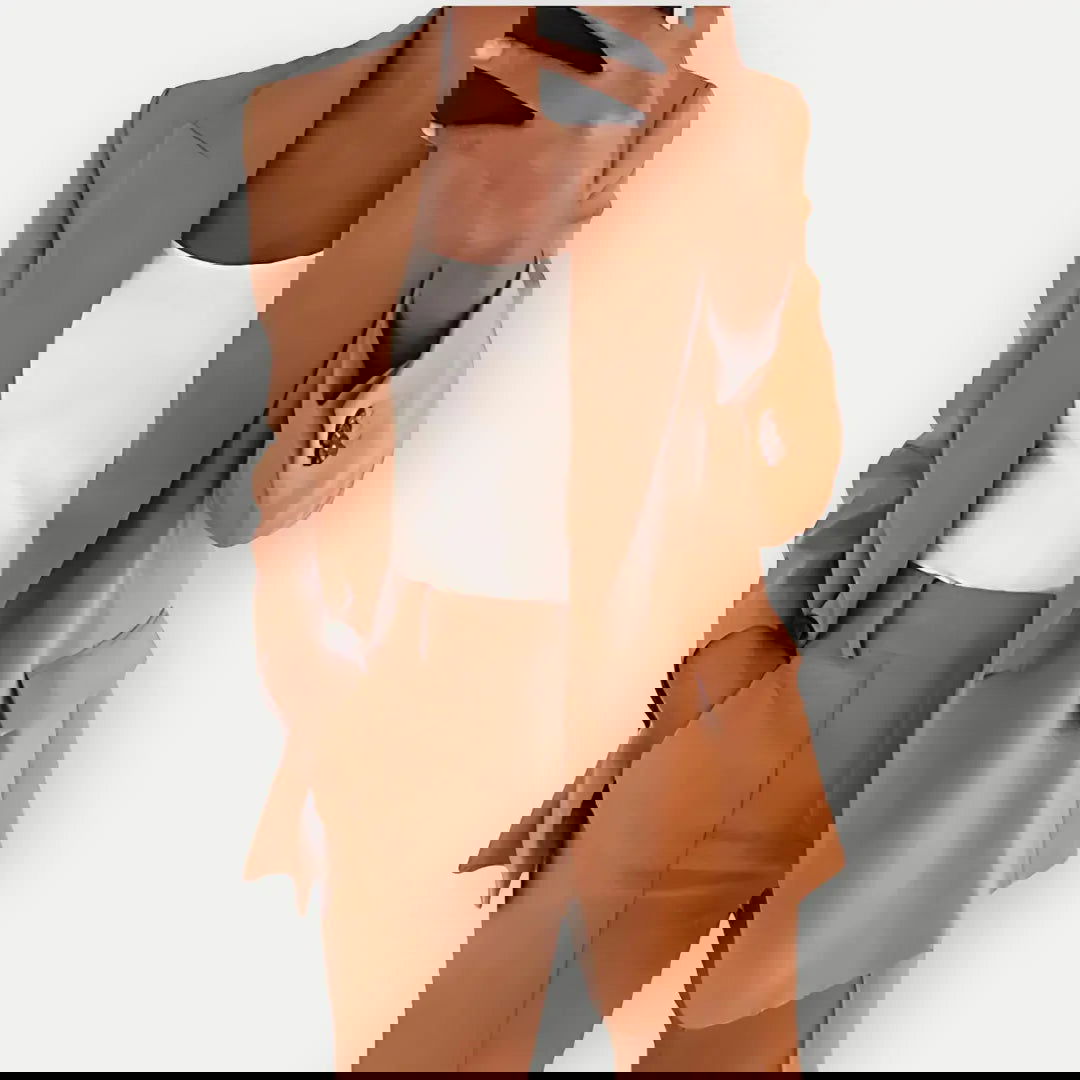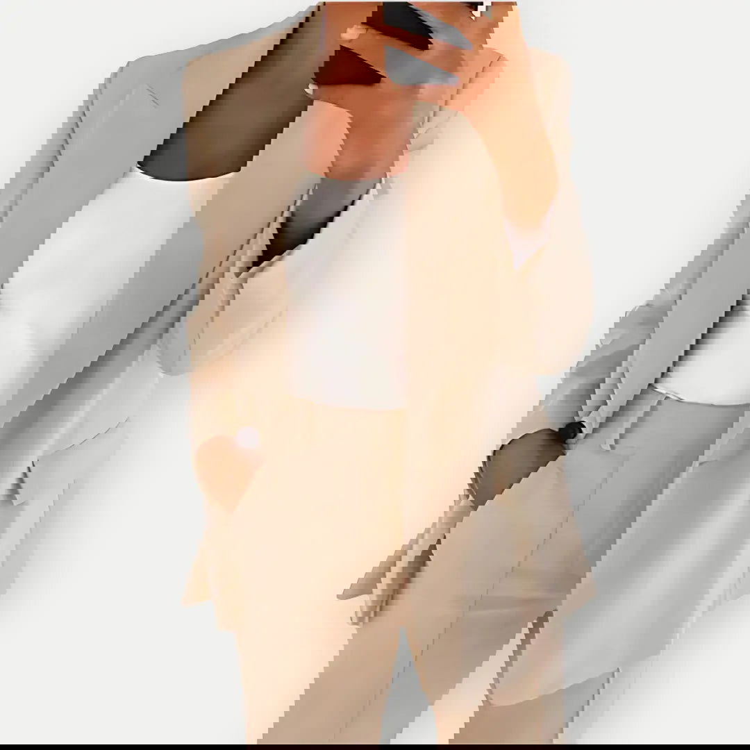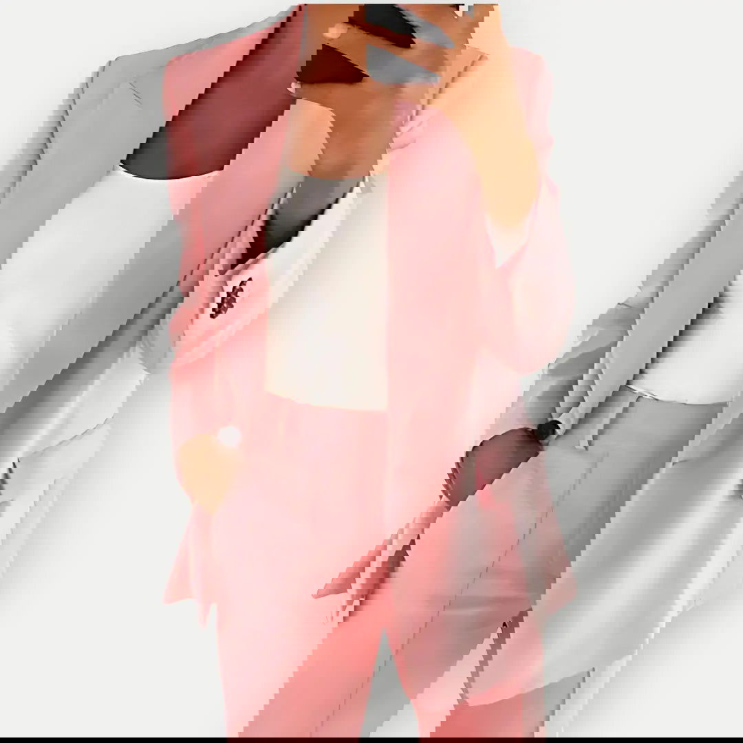 Este traje de dos piezas se distingue por su corte entallado y su diseño contemporáneo que estiliza la figura. El blazer con solapas clásicas y bolsillos de solapa se combina con un pantalón recto de cintura alta, logrando un conjunto versátil y sofisticado. Perfecto para la oficina, eventos formales o para crear un look chic en reuniones sociales.